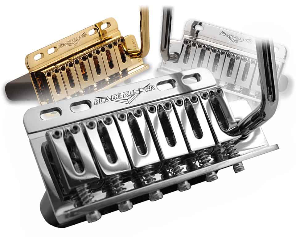 The Bladerunner is a non-locking tremolo system that is the best on the market. At Super-Vee.com, you can even custom order your Bladerunner by choosing your base, finish, mount, and bar. It is non-destructive to your guitar and keeps the classic Stratocaster look and feel. It also features "zero-friction action" to maintain tune and a positionable whammy bar. Wham!