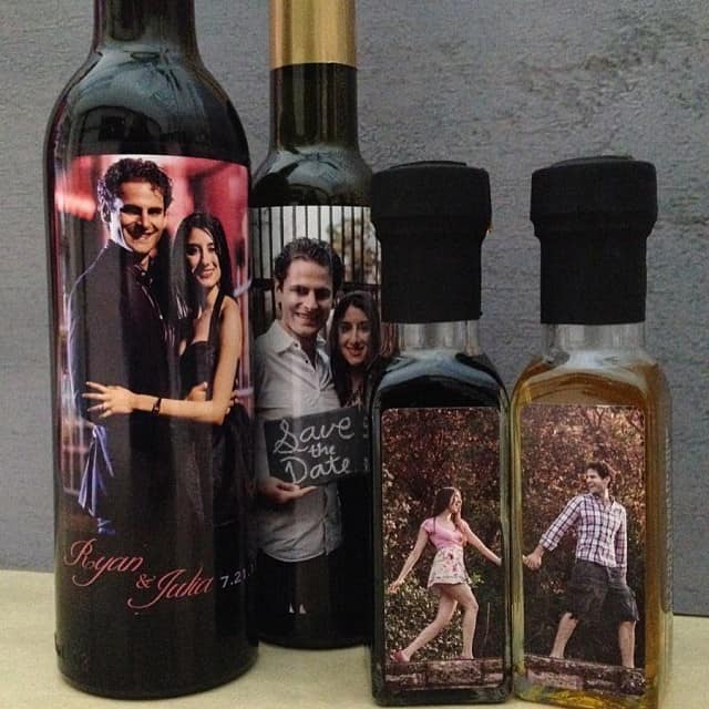 Custom wedding labels are also often used on wine bottles. Because you can put anything you like on them—including your photo, a special hand-drawn design, the exact colors of your wedding party, etc.—they’re often a more personal choice than the stock images offered by companies selling the wine. In addition to adding “wow” factor to your big day, empty wedding bottles make great souvenirs.